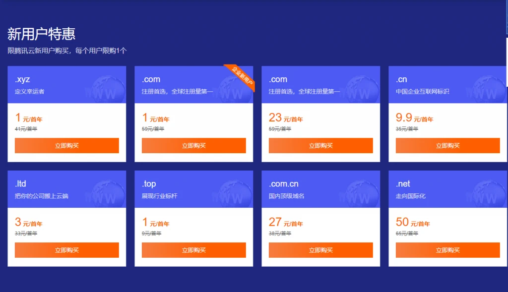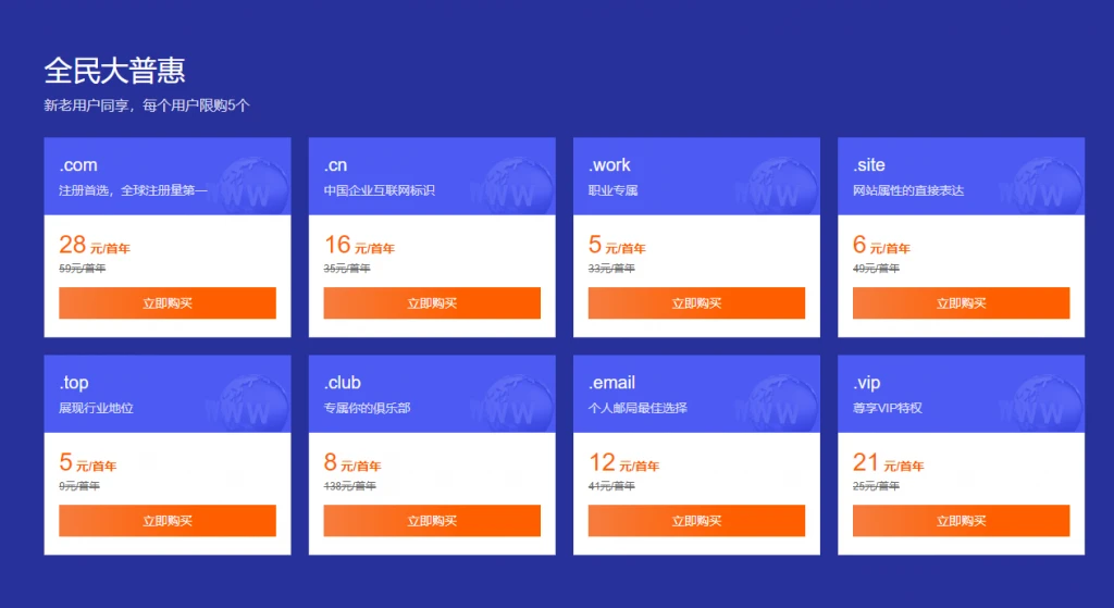新用户优惠较多,域名种类也比较常见,不过限购一个