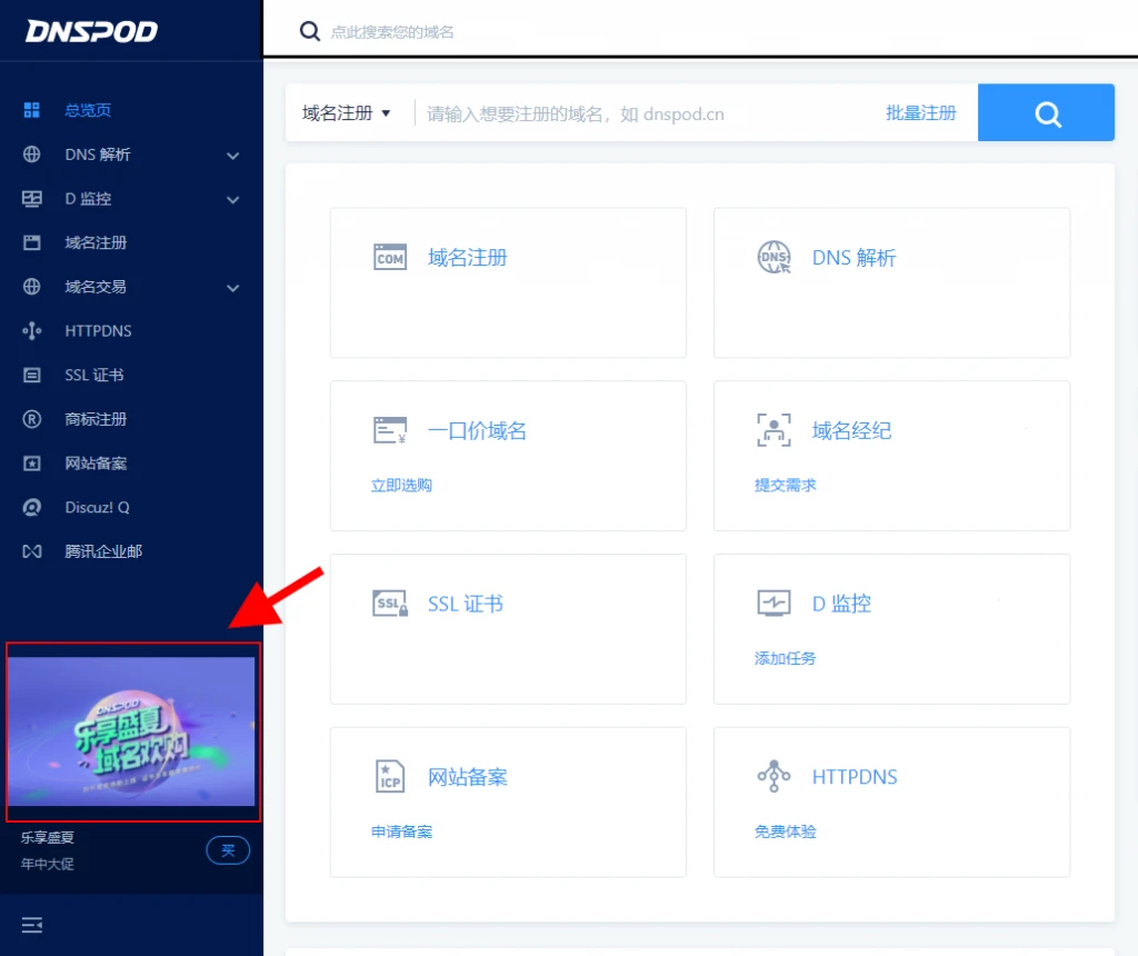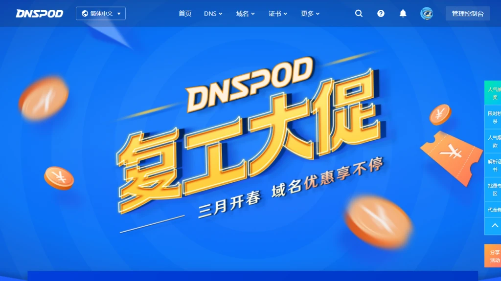 不知何时,DNSPOD也学起了他的“干爹”腾讯玩起了域名新购优惠,我也是访问管理控制台是看到的