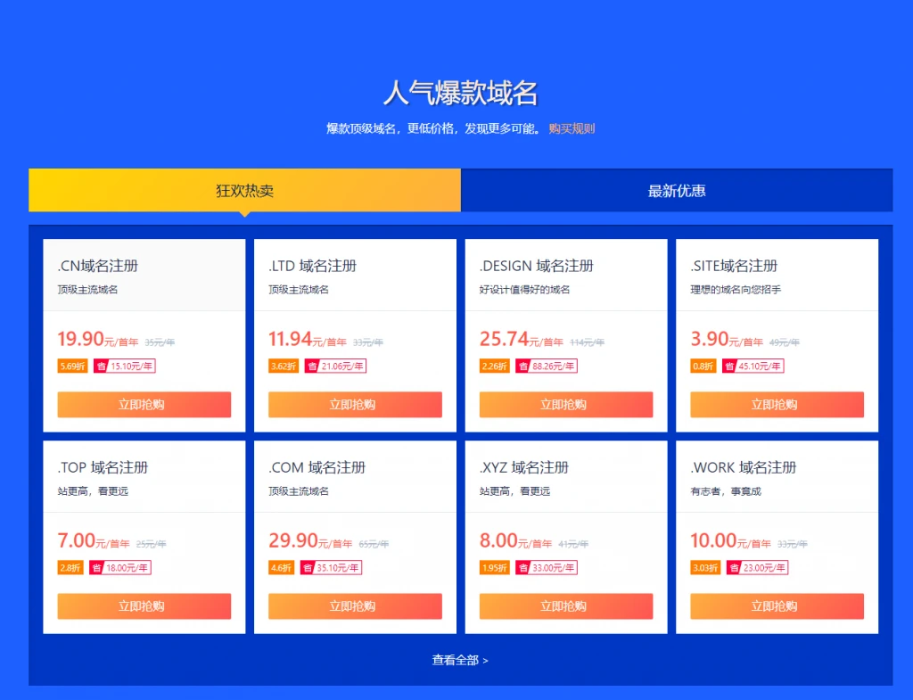 回到正题,DNSPOD的域名新购优惠主要针对.com、.cn、.top、.email、.com.cn、.vip有优惠,除了有每日秒杀外,还有不用抢购的,但比腾讯云的贵一些